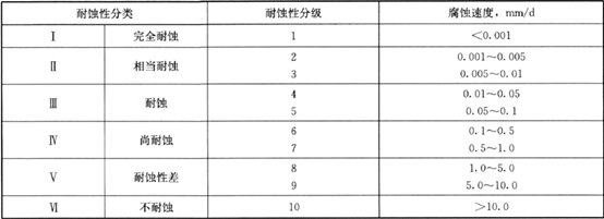 在工業上,一般用腐蝕速度表示材料的耐蝕性。腐蝕速度用單位時間內單位面積上金屬材料的損失量來表示;也可用單位時間內金屬材料的腐蝕深度來表示。工業上常用610級的耐蝕性評級標準,從I類完全耐蝕到VI類不耐蝕,見表2