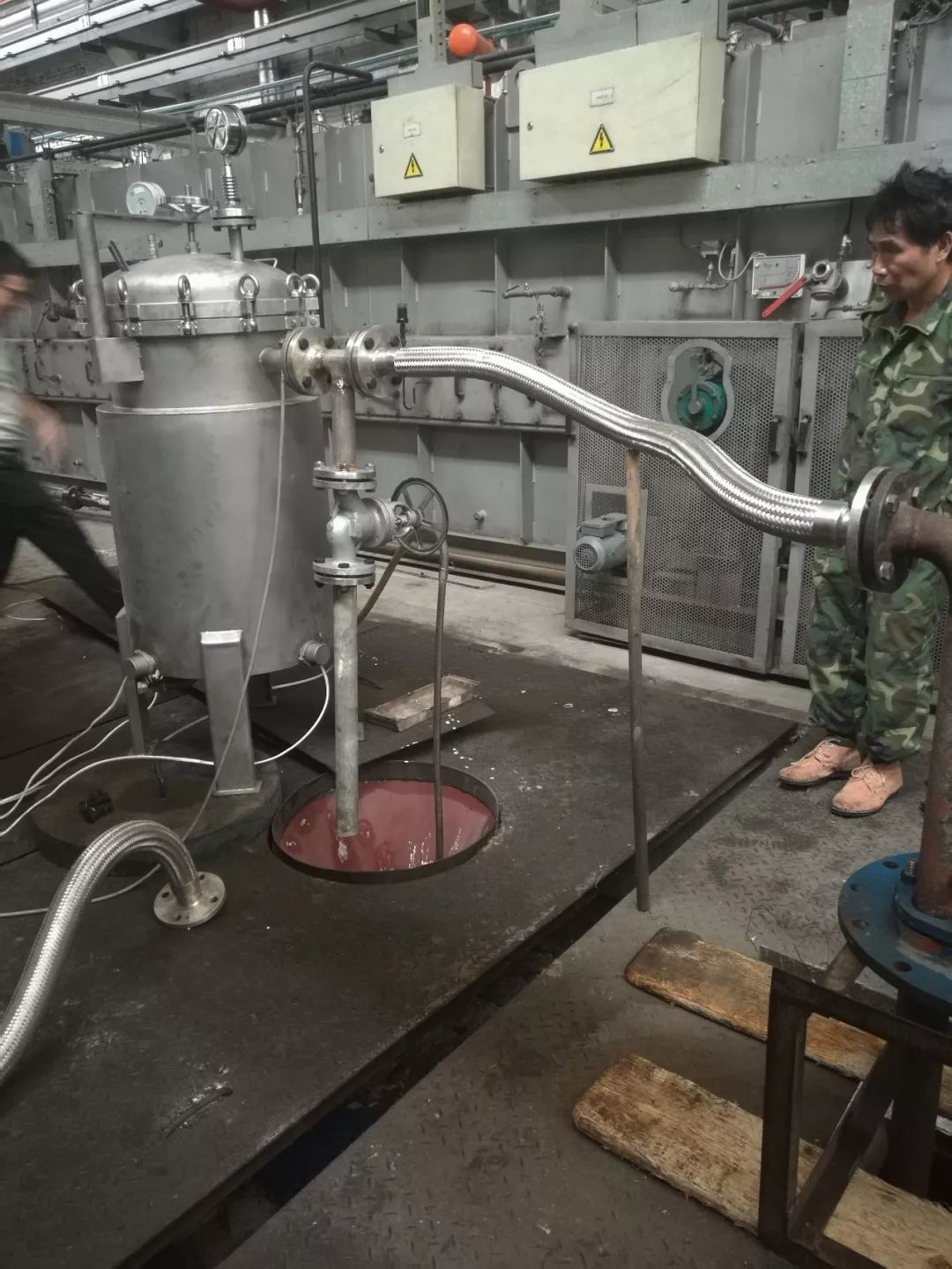 當氮基保護氣氛的輥底式鹽淬自動化生產線連續工作一定時間后,應對封閉的鹽槽中的硝鹽進行定期過濾,由于工件清洗不干凈或爐內氮基氣氛過高所導致的炭黑難免使得硝鹽浴中帶入一些雜質。我公司曾對使用約一年的生產線采用過濾機進行了現場過濾,將低溫硝鹽浴通過抽鹽泵從槽液中抽取送入可移動的過濾機中進行過濾,最終可發現在過濾袋中的凝固鹽塊中含有不少的黑色雜物,連續過濾16h后,約有將近20kg的雜物出現。附圖為現場過濾機的安裝使用場景,附圖a為過濾機以及連接的管道,附圖b為連于過濾機的管道以及抽鹽泵。從熔鹽槽將其鹽浴抽出后經過濾機過濾后,進入熔鹽槽的另一槽口。抽鹽泵固定于熔鹽槽一入口的上方。