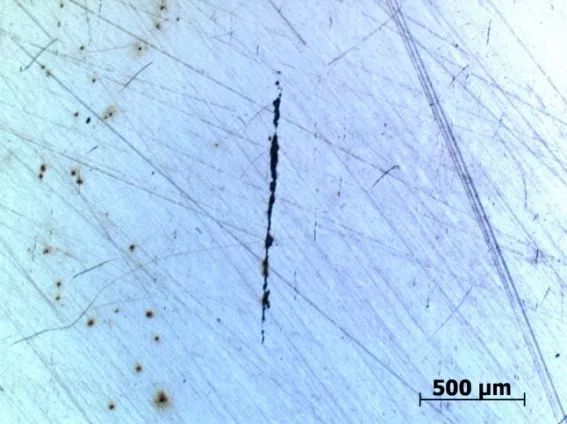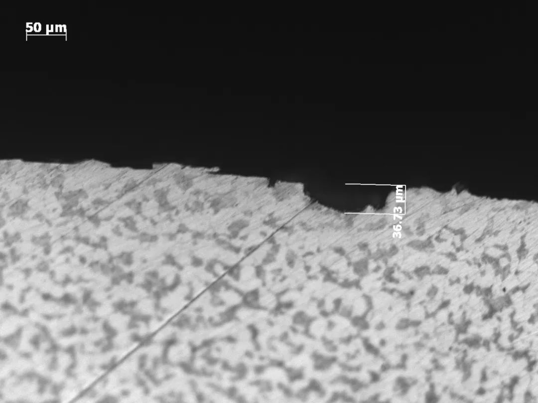 在垂直裂紋方向進行剖切,裂紋截面形貌見圖2。裂紋垂直深度約0.03mm,寬度約0.05mm;裂紋未向內延伸;腐蝕后觀察,裂紋周圍組織為正常正火組織。