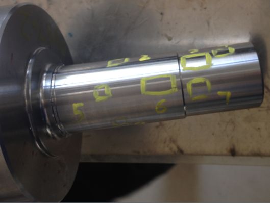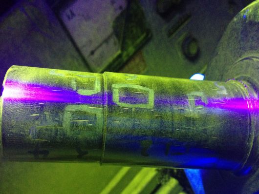 從缺陷宏觀形貌分析,由于裂紋無金屬光澤,且將缺陷部位繼續車1mm后又出現新的裂紋,因此,裂紋缺陷不僅在零件表面、且在零件內部已經形成,進而斷定缺陷不屬于機加工裂紋,該推斷經過磁粉探傷得以驗證,見圖5。對肉眼可見的缺陷用記號筆標出,在磁粉探傷前,零件上共可見7處缺陷,經過磁粉探傷,可以看出零件表面聚集了大量缺陷。