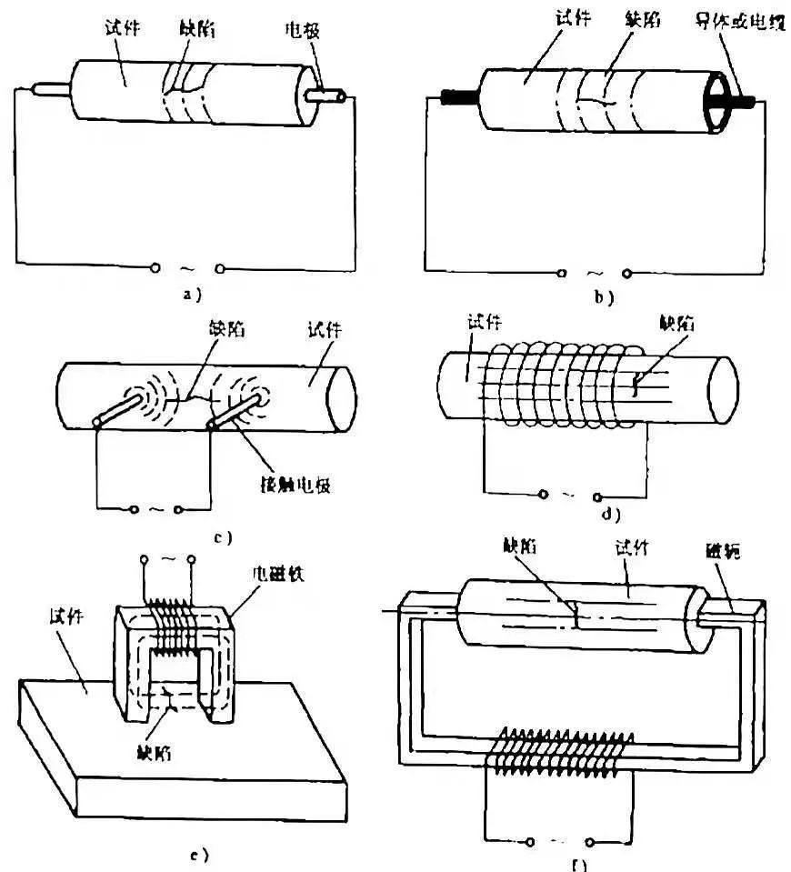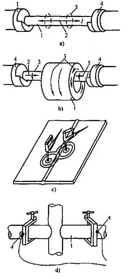 a)軸向通電法 b)中心導體法 c)電極觸電法