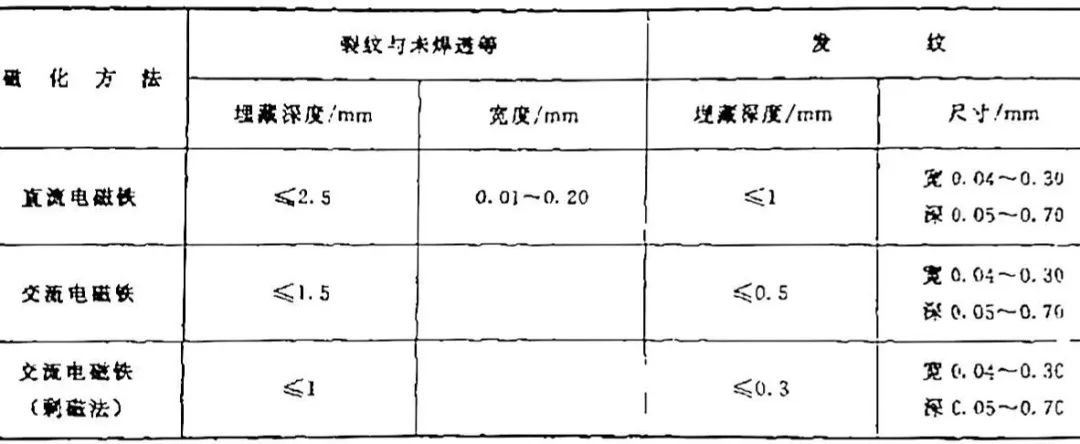 磁粉檢測靈敏度取決于磁化方法與規范、磁粉或磁懸浮液的性質、被檢物材料特性及缺陷的位置等。一些磁化方法可達到的靈敏度見表2 。
