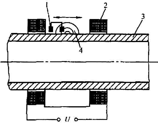 為了檢測直縫焊管的縱向缺陷,在固定的磁軛內以垂直于焊縫軸線的方向對焊管進行磁化,并使磁敏探頭以垂直于焊縫軸線方向來回移動。