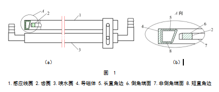 (1)調整淬火感應圈1的截面形狀,使淬火感應圈的截面形狀為直角梯形(見圖2b),淬火感應圈的三個直角邊的外周均包覆有導磁體4,導磁體進行磁場屏蔽,減少能量損失,起到了節能作用,淬火感應圈1水平放置且淬火感應圈的長直角邊5朝上,將齒圈2放置于淬火感應圈1內且齒圈2的倒角端面6朝上。
