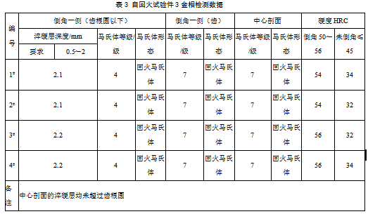 齒圈2一次淬火不能加工出想要的淬硬層,中間有斷層,通過兩次淬火,齒圈2兩端面的淬硬層深度不同,并且齒圈2的倒角端面6的硬度為50~56HRC,齒圈2的非倒角端面7的硬度為25~35HRC,倒角端面6的淬硬層深度為齒根以下0.5~2.0mm,齒寬中心剖面的淬硬層不超過齒根圓,很好地控制實現了“陰陽臉”。