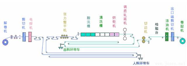 半連續式酸洗是相對于單件式和連續式而言的,由于它不需設置焊機(或設置簡易焊機如縫合機等)和大容量活套,因此,在換卷時要停機,這種方法最適合于產量在20~90萬t/a的生產。