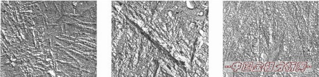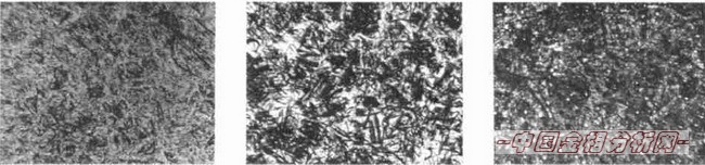 圖3a及圖3b(等溫30min)表明,短時(shí)間等溫的鐵素體片較窄,析出的碳化物較細(xì)小,分布較均勻;長(zhǎng)時(shí)間等溫的鐵素體片加寬,析出的碳化物條粗化,分布仍均勻;兩者比較可說(shuō)明鐵素體片的長(zhǎng)大受碳的擴(kuò)散和鐵素體內(nèi)析出碳化物的程度所控制。等溫60min后下貝氏體量增多,碳化物更加粗化(圖3c)。