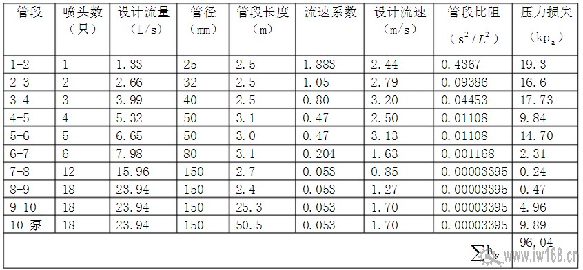 (3)設計噴水強度的校核:從表3-6和表3-7中可以看出,高、低區系統計算流量Q=23.94 L/s=1436.4 L/min,系統作用面積為160,所以系統平均噴水強度為:1436.4/160=8.98 L/min﹥8 L/min,滿足中危險級Ⅱ級建筑物防火要求。