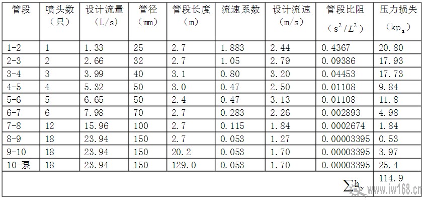 從系統最不利點開始進行編號,直至水泵處,從節點1 開始,至水池吸水管為止,進行水力計算。管段流量僅計算在作用面積范圍的噴頭,作用面積外的噴頭不計。