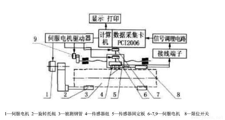 2008年蘭州理工大學材料科學與工程學院王宏等人進行了“基于虛擬儀器的大直徑焊管的形位誤差檢測系統”的研究。其原理如圖2所示伺服電機1通過相應的傳動機構帶動被測鋼管旋轉傳感器組4安裝在固定板5上固定板5固定在可沿鋼管軸向運動的導軌滑塊上使得鋼管在旋轉的同時傳感器測量組沿鋼管軸向運動以螺旋線方式采集鋼管表面的形位參數鋼管軸向放置在3個位移傳感器采集鋼管母線數據測量母線直線度另外3個測量鋼管圓度通過位移傳感器采集到的數據傳送到PC機進傳行處理得出直線度、圓度誤差。這種測量方法具有成本低、數據通信方便等優點但是接觸式測量測量比較繁瑣只能針對鋼管母線直線度的測量不能實現對鋼管軸線直線度的測量由于工廠壞境惡劣所以抗干擾能力差。