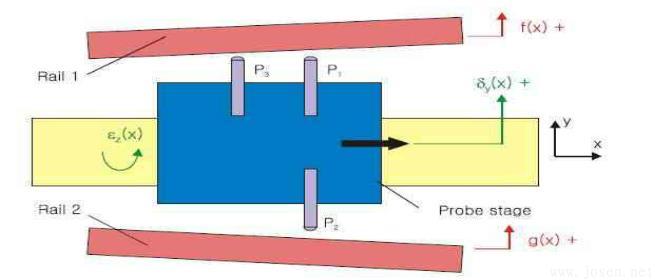 同樣的在國外各國也都努力的尋求新的方法去解決這一方面的難題。2006年日本Tohoku大學提出一種對超精密導軌平行性和直線度測量的三探針測量系統。該系統可用于測量一對鋼軌的平行度和直線度。測量平行度使用反向法而直線度測量用兩點連續的方法。實驗用測量數值算法分析一對職能明確的導軌來驗證這個三探針系統。同樣的該系統的測量方法也可以用于對鋼管直線度的測量。系統并行性和直線度測量的安裝程序如圖3所示: