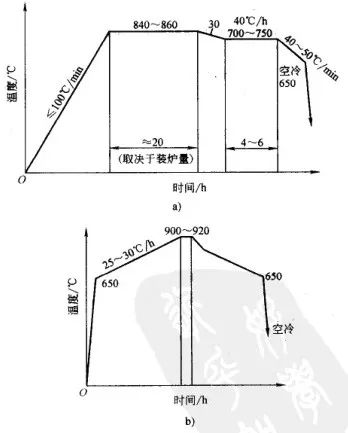退火的保溫時間根據裝爐量等情況有所不同,一般應在3~4h以上。保溫后可采用10℃~20℃的速度冷卻至600℃以下出爐。也可以采用冷卻至740℃~760℃,停留4~5h,再冷至600℃以下出爐的等溫退火方法。