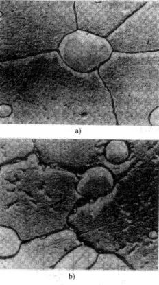 圖5 a)是中間沒有停留,奧氏體化后直接水冷,可以看到沒有析出物,晶界很清晰。圖5 b)是從1190℃冷卻到980℃,停留了30s,可以看到晶界及基體內都明顯的有小顆粒狀碳化物析出。