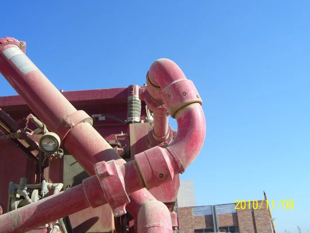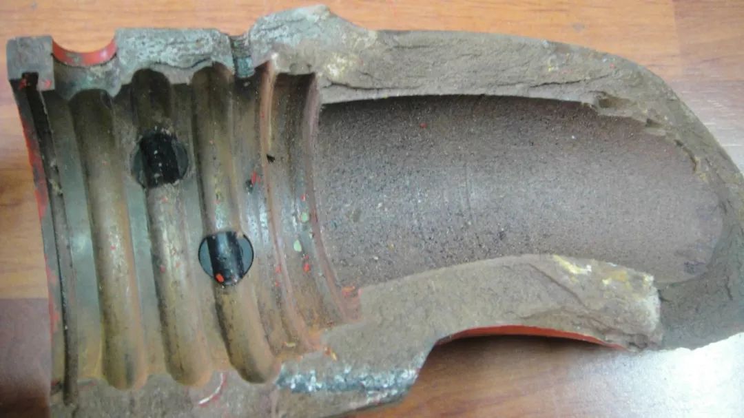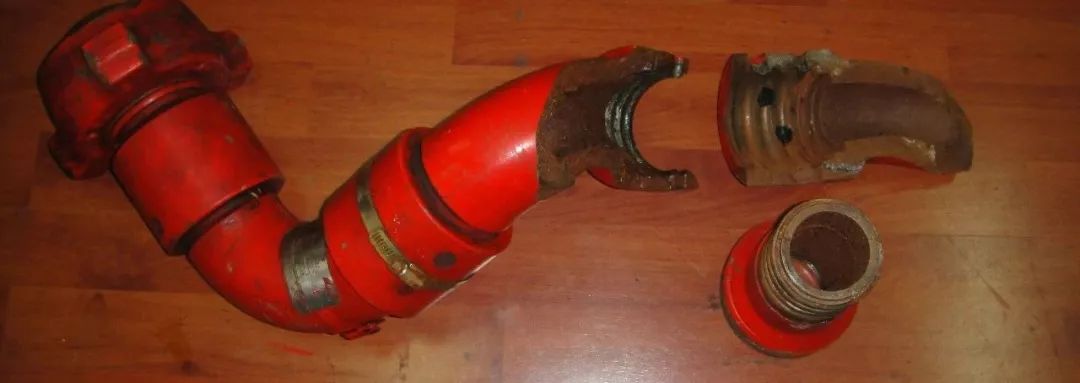 高壓活動接頭為石油鉆采管路的關(guān)鍵連接件,在石油鉆采中主要起輸送流體的作用。 由于活動彎接頭多安裝在管路變向拐彎處(如圖1),常因流體擁堵和沖刷造成較大的應力集中,加之材料不可避免地存在一些微觀缺陷,在高壓下極易發(fā)生爆裂(見圖2),導致井液泄漏噴射,危及人身安全,帶來很大的事故隱患。為此,我們對某油田現(xiàn)場發(fā)生開裂的彎頭進行了全面分析,找出了爆裂的原因,并進行了工藝改進,取得了滿意的效果。