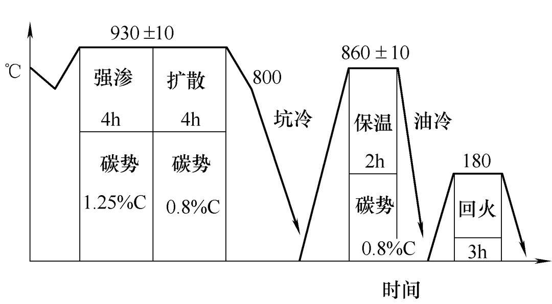 該零件材料為20CrNiMo,技術(shù)要求:表面滲碳硬度56~62HRC,滲碳層深1.0~1.2mm,心部硬度25~30HRC。彎頭加工工藝路線:鍛造→正火→粗車→時效→精加工→彈道滲碳淬火→噴砂修磨→磁粉探傷→成品。為保證表面硬度,采用圖3所示的滲碳淬火工藝。