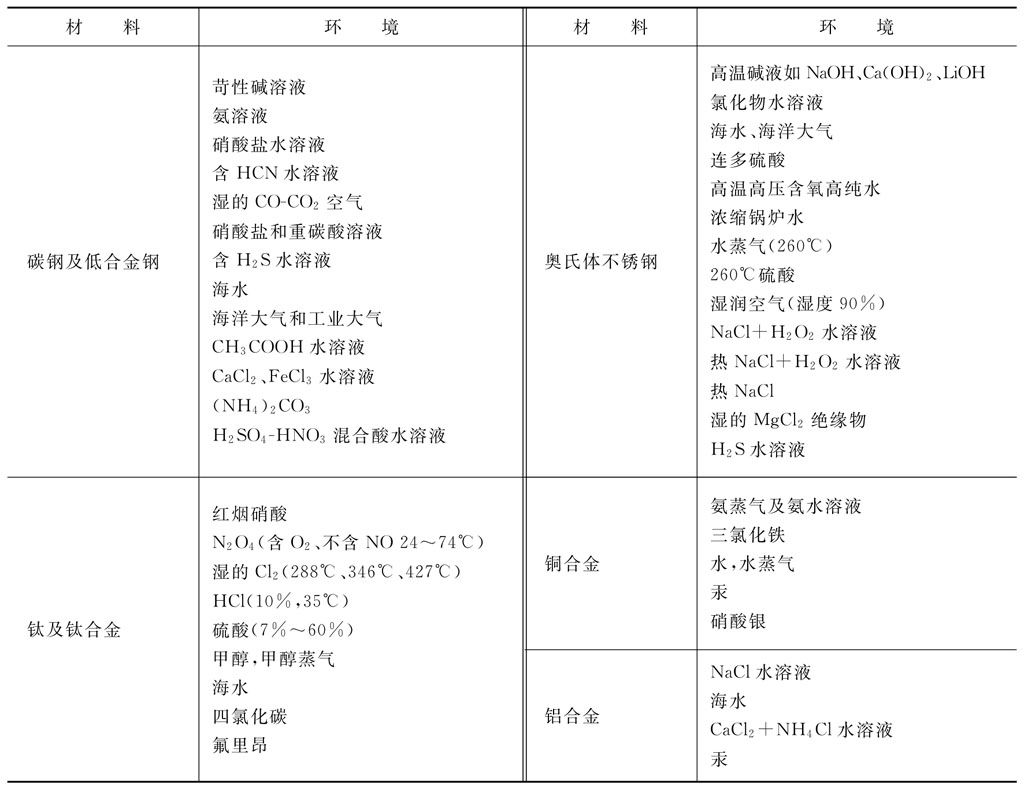 表1 易產(chǎn)生應(yīng)力腐蝕開(kāi)裂的金屬材料和腐蝕環(huán)境組合(選自SH 3059附錄E)