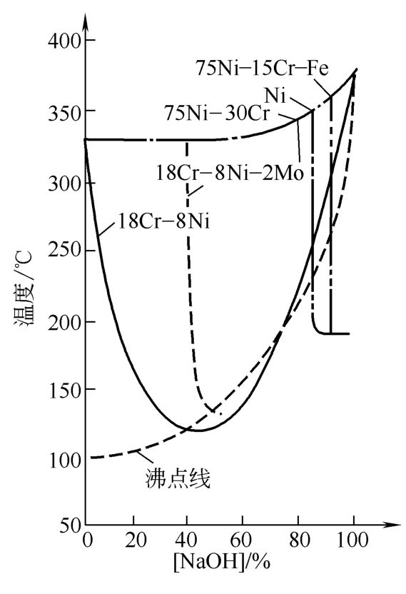 氫氧化鈉濃度在0.1%以上的濃度時(shí)18-8型奧氏體不銹鋼即可發(fā)生堿脆。以氫氧化鈉濃度40%最危險(xiǎn),這時(shí)發(fā)生堿脆的溫度為115℃左右。超低碳不銹鋼的堿脆裂紋為穿晶型,含碳量高時(shí),堿脆裂紋則為晶間型或混合型。當(dāng)奧氏體不銹鋼中加入2%鉬時(shí),則可使其堿脆界限縮小,并向堿的高濃度區(qū)域移動(dòng)。鎳和鎳基合金具有較高的耐應(yīng)力腐蝕的性能,它的堿脆范圍變得狹窄,而且位于高溫濃堿區(qū)。