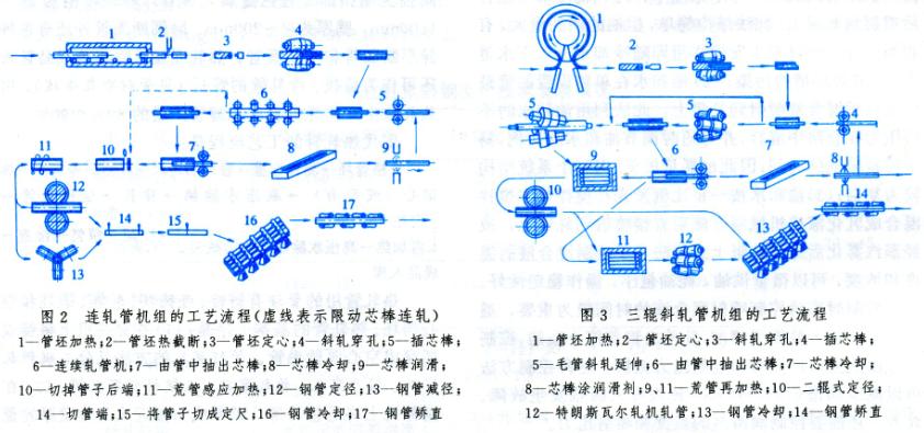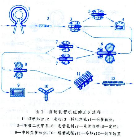 熱軋管用的管坯有鑄錠、連鑄坯、軋坯、鍛坯和空心鑄坯。熱軋管的基本工序是:(1)在穿孔機(jī)上將錠或坯穿成空心厚壁毛管。管坯穿孔的方法又分二輥斜軋穿孔、壓力穿孔、推軋穿孔、三輥斜軋穿孔等。(2)在延伸機(jī)上將毛管軋薄,延伸成為接近成品管壁厚的荒管。毛管延伸即毛管軋制的方法有:自動(dòng)軋管機(jī)軋管,連續(xù)軋管機(jī)軋管,三輥和二輥軋管機(jī)斜軋(見管材料軋延伸),周期式軋管機(jī)軋管,頂管機(jī)頂管。(3)荒管在精軋機(jī)上精軋成成品管?;墓芫埌ㄒ愿纳瀑|(zhì)量為目的的管材均整和管材定徑以及以擴(kuò)大產(chǎn)品規(guī)格為目的的管材減徑和管材熱擴(kuò)徑。