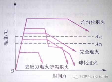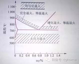 根據鋼鐵材料的化學成分和退火目的的不同,退火通常分為完全退火、等溫退火、球化退火、去應力退火、均勻化退火等。(部分退火的加熱溫度范圍如圖 01所示。部分退火工藝曲線如圖 02所示。)