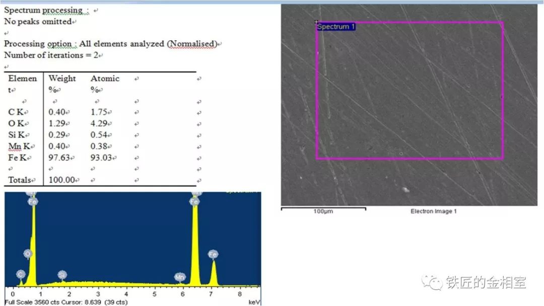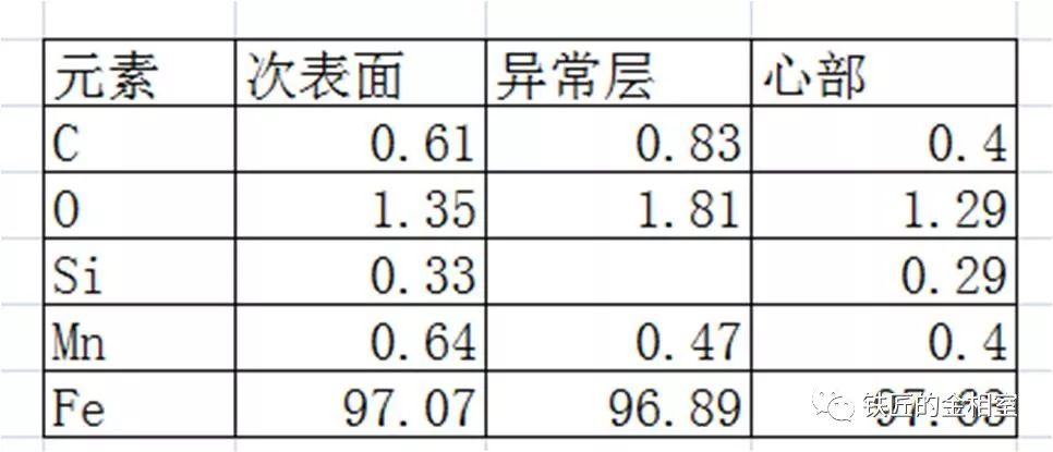 于是小徒弟去找大何了,和大何兩個在電鏡下?lián)v鼓了半天,拿著EDS的檢測數(shù)據(jù)回來找?guī)煾悼?,表層異常組織檢測結(jié)果 :