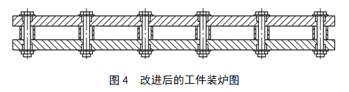 針對這種情況,我們改變了工藝,首先我們改進了工件把合的方法,在兩工件間用套筒將其隔開,再把工件把合,減小淬火的截面積。如圖4所示。