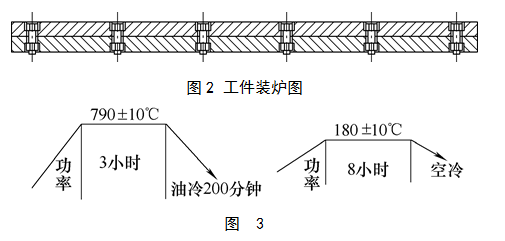 為防止工件變形,我們將工件每兩件用螺栓把合在一起,淬火面朝外。如圖2工件立裝在料盤上,在臺車爐上進行熱處理,工藝如圖3所示。