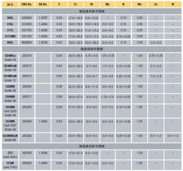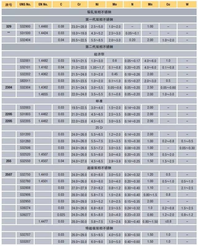 * 最大值,除非指明范圍或說明是最小值。- 標(biāo)準(zhǔn)中未指明。** 這一種鋼最初沒有添加氮,被認(rèn)為是未加氮的第一代雙相不銹鋼。