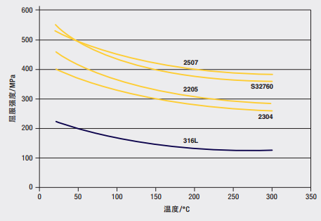 雙相不銹鋼的強(qiáng)度大約是常規(guī)奧氏體不銹鋼或鐵素體不銹鋼強(qiáng)度的2倍。因此設(shè)計(jì)師在某些應(yīng)用中就可減薄壁厚。下圖比較了室溫到300℃的溫度區(qū)間幾種雙相不銹鋼與316L奧氏體不銹鋼的屈服強(qiáng)度。