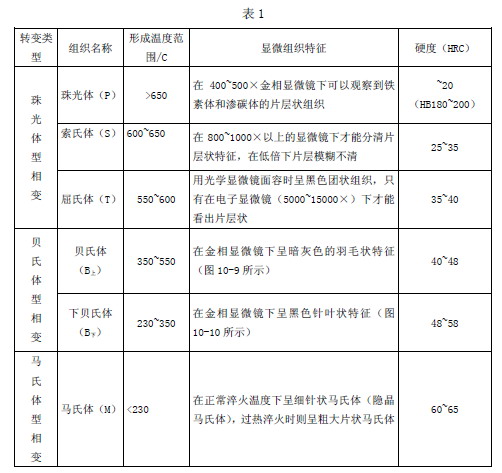 共析鋼過冷奧氏體在不同溫度等溫轉(zhuǎn)變的組織及性能列于表1中。