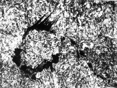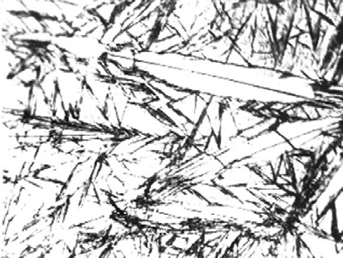 B、下貝氏體是在片狀鐵素體內(nèi)部沉淀有碳化物的兩相混合物組織。它比淬火馬氏體易受浸蝕,在顯微鏡下呈黑色針狀(如圖5)。在電鏡下可以見到,在片狀鐵素體基體中分布有很細的碳化物片,它們大致與鐵素體片的長軸成55~60°的角度。
