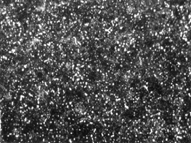(5)殘余奧氏體(A殘) 是含碳量大于0.5%的奧氏體淬火時被保留到室溫不轉(zhuǎn)變的那部分奧氏體。它不易受硝酸酒精溶液的浸蝕,在顯微鏡下呈白亮色,分布在馬氏體之間,無固定形態(tài)。在圖8表示含碳1.2%的碳鋼正常淬火(780℃加熱),其組織為馬氏體+粒狀滲碳體+少量殘余奧氏體。