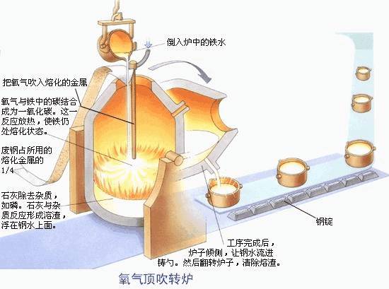 生鐵中的各種雜質,在高溫環境下,不同程度上都與氧有較大的親和力。因此可以利用氧化的方法使它們成為液體、固體或氣體氧化物,液體和固體氧化物在高溫下與爐襯和加入爐內的熔劑進行反應,結合成爐渣,并在扒渣時被排除爐外,氣體也在鋼水沸騰時被CO帶到爐外。