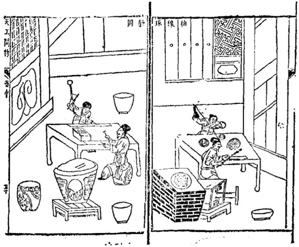 明 宋應(yīng)星 天工開物中的抽線琢針圖