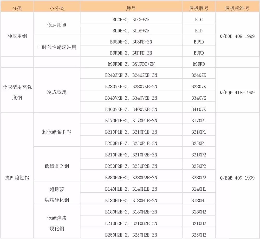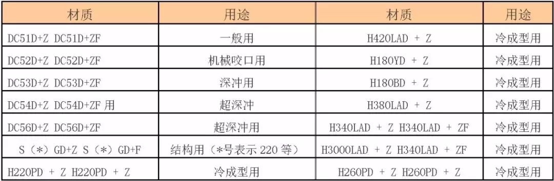Q195、Q215、Q235、08AL、SPCC、SPCD、SPCE、SPCEN、ST12、ST13、ST14、ST15、ST16、DC01、DC03、DC04、DC05、DC06等;