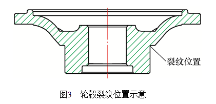 對裂紋輪轂進行磁粉探傷,發現裂紋均出現在同一位置,裂紋位置如圖3所示,裂紋沿工件外圓擴展,最大處沿外圓處裂紋一周。