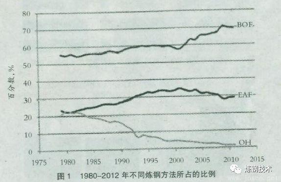 自此,氧氣轉(zhuǎn)爐煉鋼得到快速發(fā)展,而平爐煉鋼開(kāi)始下降,如圖1所示。氧氣轉(zhuǎn)爐煉鋼發(fā)展超過(guò)平爐煉鋼的一個(gè)重要因素是連鑄技術(shù)的引進(jìn)。連鑄要求鋼水源源不斷供應(yīng),而氧氣轉(zhuǎn)爐的工藝時(shí)間比較短,能很容易地滿足連鑄的鋼水供應(yīng),一個(gè)大轉(zhuǎn)爐(350t)的產(chǎn)鋼速度為500t/h。與此相對(duì)照,如果平爐常規(guī)操作,煉鋼至出鋼需要12—14h,或者如果借助工業(yè)用氧加速也需要7—8h。目前在烏克蘭、俄羅斯和印度仍然存在一定數(shù)量的平爐冶煉。這些爐子正逐步被電弧爐取代,2012年平爐工藝總產(chǎn)鋼量1690萬(wàn)t,約占全球鋼產(chǎn)量的1.1%。
