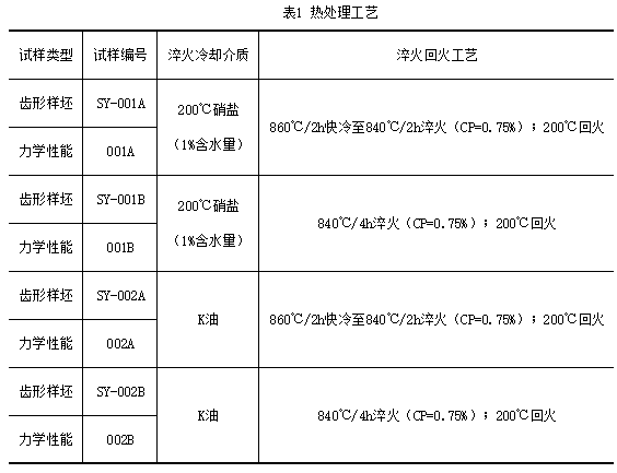 每組試樣由齒形樣坯1件、力學(xué)性能試棒2件組成。4組試樣同爐滲碳,滲碳工藝時(shí)間45h(強(qiáng)滲碳勢(shì)1.15%時(shí)間30h、擴(kuò)散碳勢(shì)0.75%時(shí)間15h),760℃保溫2h出爐緩冷至300℃空冷;后采取4種淬火回火工藝進(jìn)行對(duì)比性試驗(yàn)。試樣熱處理工藝見(jiàn)表1。