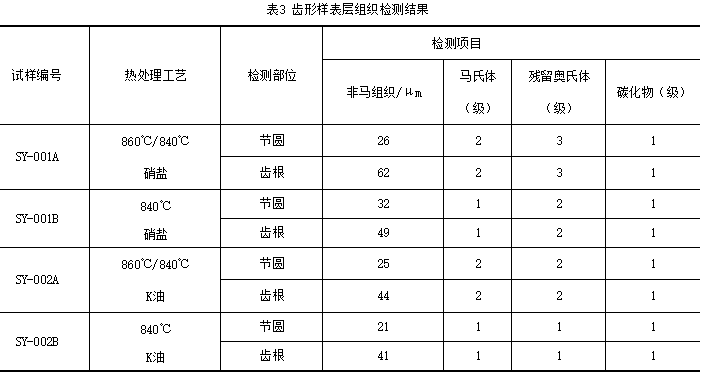 ①對(duì)于12模數(shù)20CrMnMo齒形樣而言,滲碳后采用硝鹽或油淬后,齒根處非馬組織深度均約為節(jié)圓處的1倍。相同淬火奧氏體化加熱工藝,鹽浴與K油淬火的非馬組織深度無(wú)明顯差別。