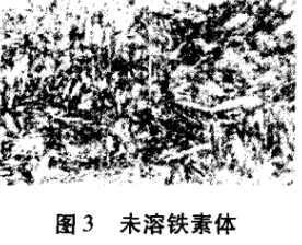 如亞共析鋼,當加熱溫度在 Ac3與 Ac1之間(例如25#鋼淬火加熱溫度低于 860℃) 時, 因鐵素體未完全溶入奧氏體,淬火后不能得到均勻一致的馬氏體,得到的是鐵素體和馬氏體,影響工件硬度。從金相分析可見未溶鐵素體 (如圖3所示)。