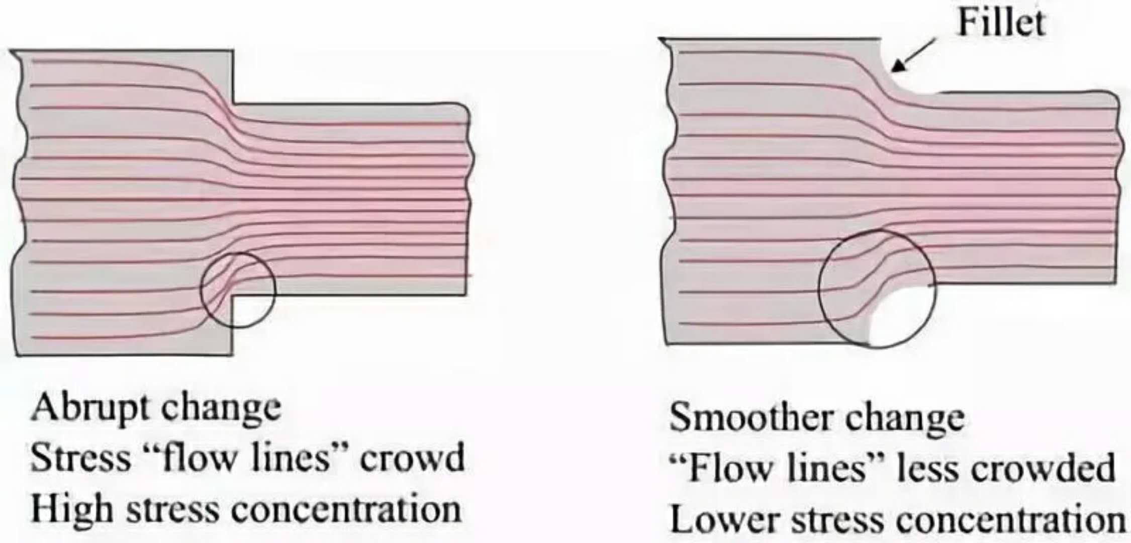 實際上,所有的疲勞失效都發(fā)生在應力集中點或應力集中處的零件的外表面上。例如,凹槽、圓角、孔、螺紋、鍵槽、花鍵、焊縫等。如果該部件提供長期無故障的服務,設計者必須考慮到這些應力提升器的影響。應力集中的作用直接與其半徑小有關。與先前提到的促進疲勞失效的微裂紋一樣,應力發(fā)生位置的半徑越小,產(chǎn)生的應力越集中越大。有趣的是,應力集中對高延展性的金屬影響很小。其解釋是,由幾何變化引起的應力集中被限制在屈服應力,止于塑性變形。