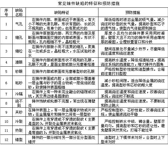 鑒定鑄件的質(zhì)量,不僅僅是為了發(fā)現(xiàn)缺陷和對質(zhì)量進行分級,更重要的是要找出產(chǎn)生缺陷的原因,制定出預防缺陷產(chǎn)生的技術(shù)措施和組織措施。常見鑄件缺陷的特征和預防措施見下表。