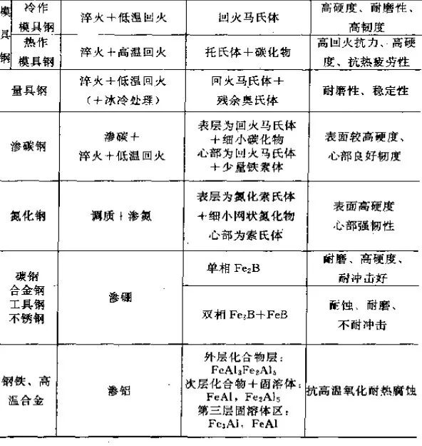 各種熱處理工藝處理過(guò)的工件,其使用狀態(tài)下的組織及性能要求如表1所示 。