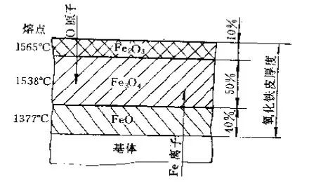 氧化是鋼在空氣等氧化性氣氛中加熱時(shí),表面產(chǎn)生的氧化層。氧化層由Fe2O3、Fe3O4、FeO 三種氧化物組成,外表面有過(guò)剩的氧存在,因而形成含氧較高的氧化物Fe2O3,在靠近基體的內(nèi)部,由于氧少金屬多,因而形成含氧較低的氧化物FeO,氧化層中間部分為 Fe3O4 ,即由外層到內(nèi)層氧化過(guò)程逐漸減輕,如圖2 所示 。