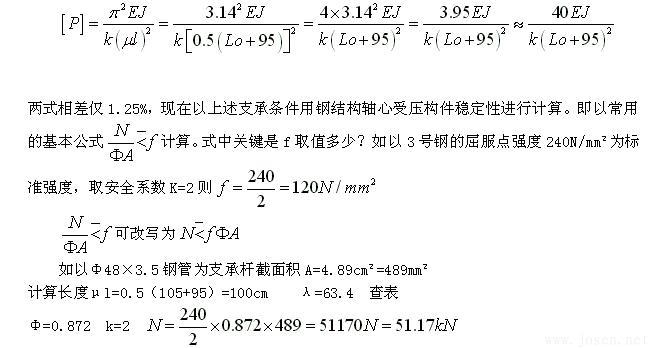 鋼管內應力如超過屈服點,變形就急劇增加,支承桿就出現失穩現象,所以不允許應力達到屈服點,其承載能力不允許達到117kN,當然更不可能用到128kN。由此可以肯定(GBJ113-87)附錄三的支承桿承載能力計算公式不使用于Ф48或更大的鋼管。
