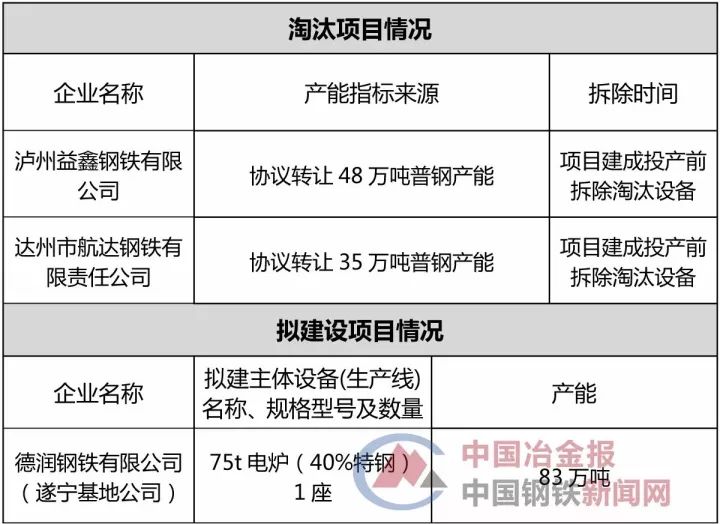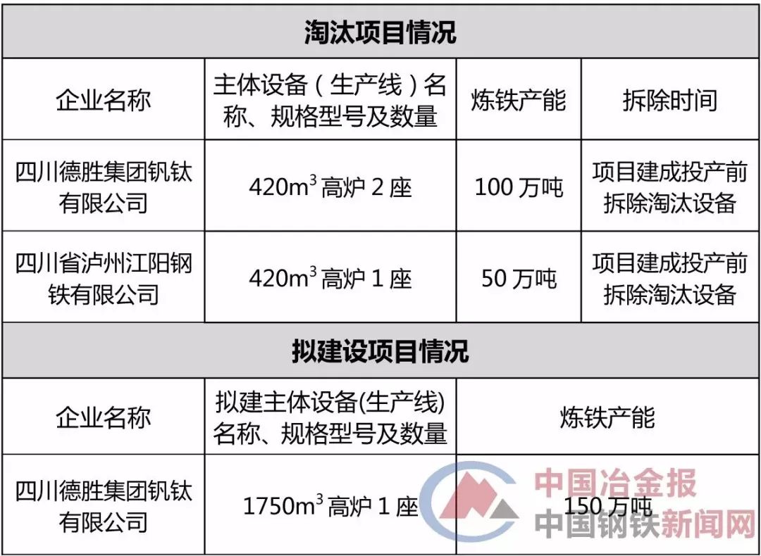 瀘州益鑫鋼鐵有限公司48萬噸煉鋼產(chǎn)能轉(zhuǎn)讓給德潤鋼鐵有限公司(遂寧基地公司),2萬噸煉鋼產(chǎn)能轉(zhuǎn)讓給眉雅鋼鐵有限公司(雅安基地公司),2萬噸煉鋼產(chǎn)能直接淘汰,其余產(chǎn)能全部用于此次置換;四川省瀘州江陽鋼鐵有限公司50萬噸煉鐵產(chǎn)能轉(zhuǎn)讓給四川德勝集團(tuán)釩鈦有限公司,其余產(chǎn)能全部產(chǎn)能用于此次置換。