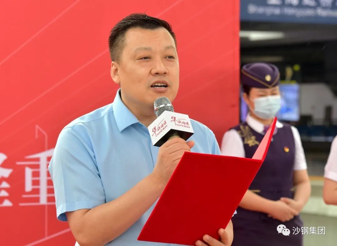 他表示,99年前,中國共產(chǎn)黨在上海成立。99年波瀾壯闊,黨帶領(lǐng)全國人民取得一個(gè)又一個(gè)勝利,實(shí)現(xiàn)中國歷史上亙古未有的偉大跨越。今天,我們懷著崇敬的心情再次踏上這片熱土,見證沙鋼品牌列車首發(fā)這一歷史性時(shí)刻。飛馳的列車,是中國經(jīng)濟(jì)、科技發(fā)展的縮影。而中國的發(fā)展史上,必有張家港一筆。40多年前,張家港創(chuàng)下28個(gè)全國第一、實(shí)現(xiàn)“三超一爭(zhēng)”,榮膺全國文明城市“五連冠”,一面“團(tuán)結(jié)拼搏、負(fù)重奮進(jìn)、自加壓力、敢于爭(zhēng)先”的張家港精神大旗飄揚(yáng)在奔涌大江之畔。沙鋼是張家港精神的踐行者。45年砥礪奮進(jìn),沙鋼堅(jiān)持黨建引領(lǐng)、堅(jiān)守“鋼鐵報(bào)國”初心,瞄準(zhǔn)世界最前沿技術(shù),實(shí)現(xiàn)從引進(jìn)、消化到超越、引領(lǐng)的飛躍,發(fā)展成為全國最大的民營鋼鐵企業(yè),連續(xù)11年躋身世界500強(qiáng)。沙鋼品牌列車這張靚麗的“流動(dòng)名片”,必將進(jìn)一步提升張家港和沙鋼的知名度、美譽(yù)度和影響力。