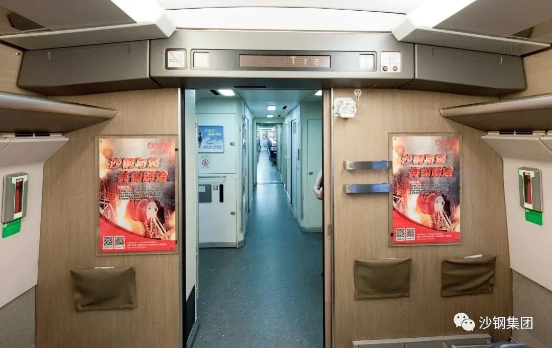 車廂門兩邊貼有沙鋼海報(bào),海報(bào)印有“沙鋼與您共創(chuàng)輝煌”八字和沙鋼產(chǎn)品簡(jiǎn)介;小桌板背面是“百煉成鋼、鑄就非凡”和產(chǎn)品簡(jiǎn)介,正面貼圖是氣勢(shì)恢宏的沙鋼大廈;頭片同樣印著“沙鋼與您共創(chuàng)輝煌”,每一張海報(bào)、標(biāo)語、桌貼上都有沙鋼LOGO和二維碼。
