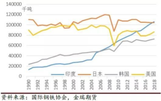 2015年印度粗鋼產量8900萬噸,正式超越美國成為世界第三大鋼鐵生產國;2018年粗鋼產量1.06億噸,首次超越日本成為世界第二,但僅為中國粗鋼產量的11%。