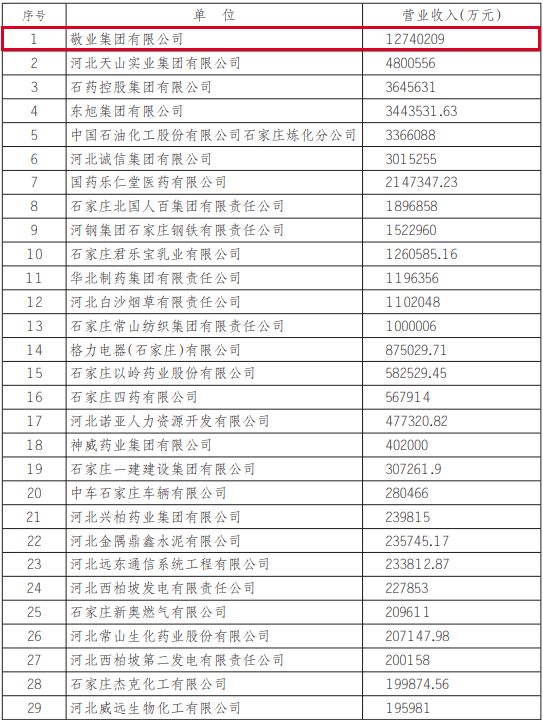 2020年11月28日,由石家莊市企業聯合會、石家莊市企業家協會(以下簡稱石企聯)舉行的2020石家莊百強企業發布會在以嶺健康城舉行。會上2020石家莊市百強企業揭曉。其中,敬業集團以1274億元的營業收入高居2020石家莊市百強企業排名榜首,連續十二年蟬聯石家莊市百強企業第一位。