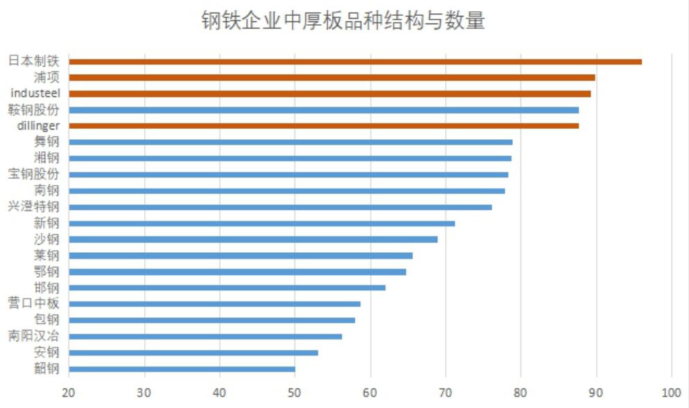 國際上的Indu-Steel、德國Dillinger和韓國浦項以及國內的鞍鋼,其綜合品種能力稍遜并緊跟日本制鐵的步伐。對于國內企業唯一跑在前面的鞍鋼,在部分重點領域的品種短板也對綜合能力的提升產生阻礙。